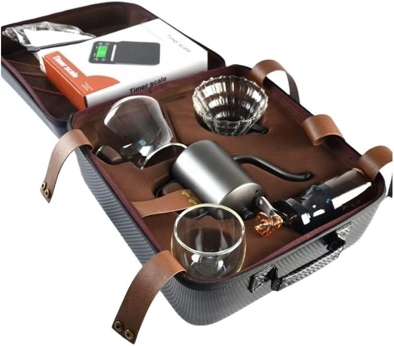 - 🔹 👜 Portable & Travel-Ready Design This coffee set comes packed in a zippered travel bag with dedicated compartments, making it easy to transport without damaging any components. Whether you’re camping, traveling, or working at the office, this kit ensures fresh coffee is always within reach.