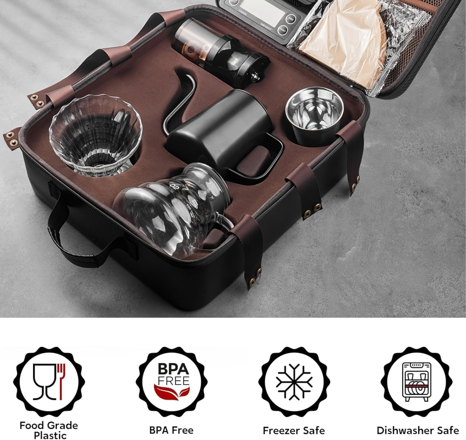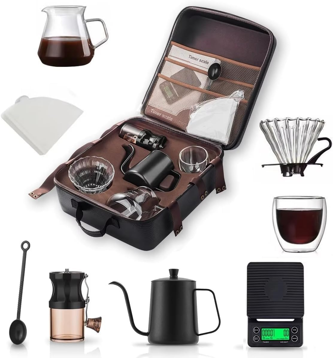 This product includes a full 7-piece coffee brewing set with accessories and case. Coffee beans, mugs, or external tools shown in imagery are for demonstration purposes only and not included unless stated.