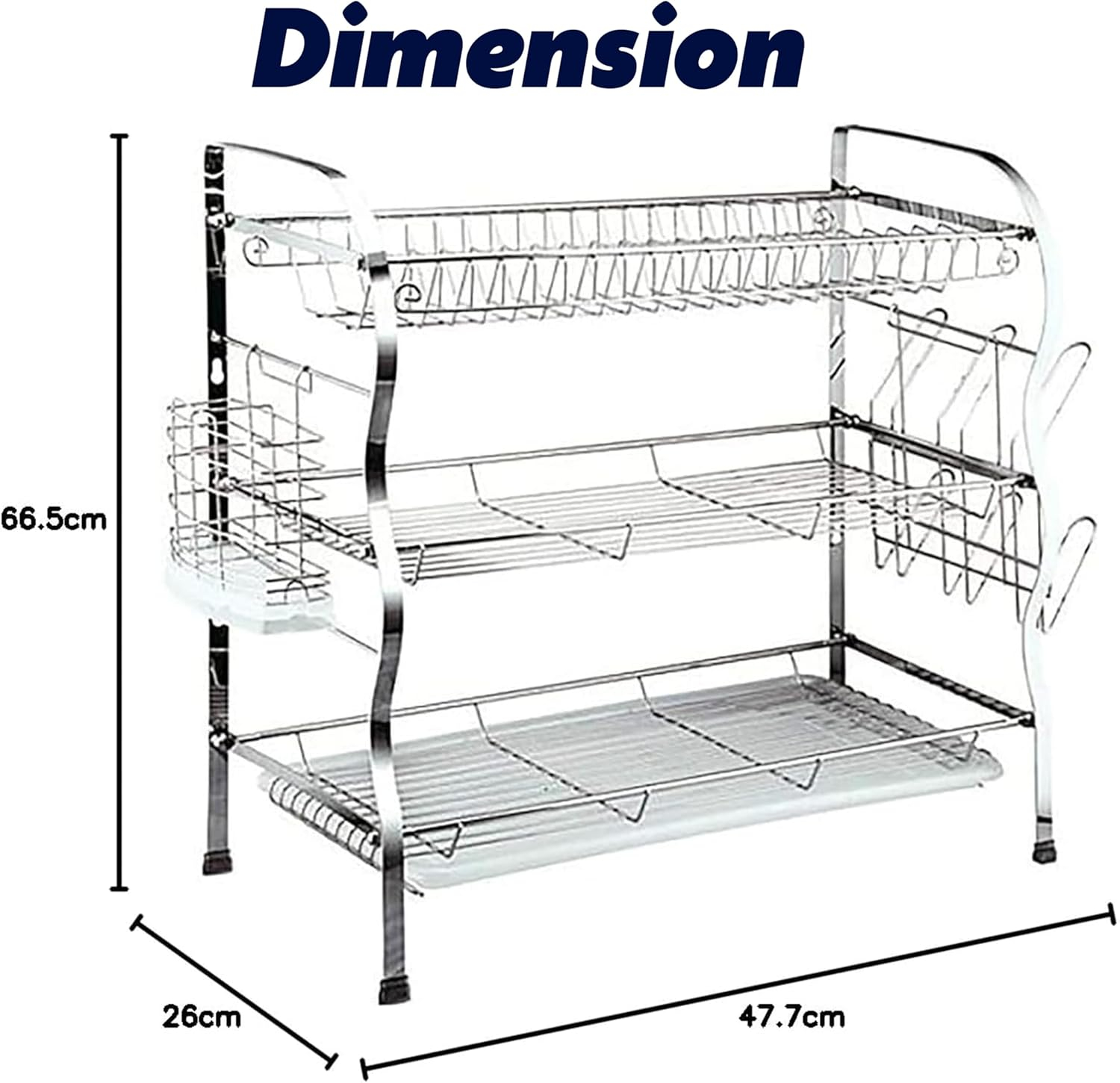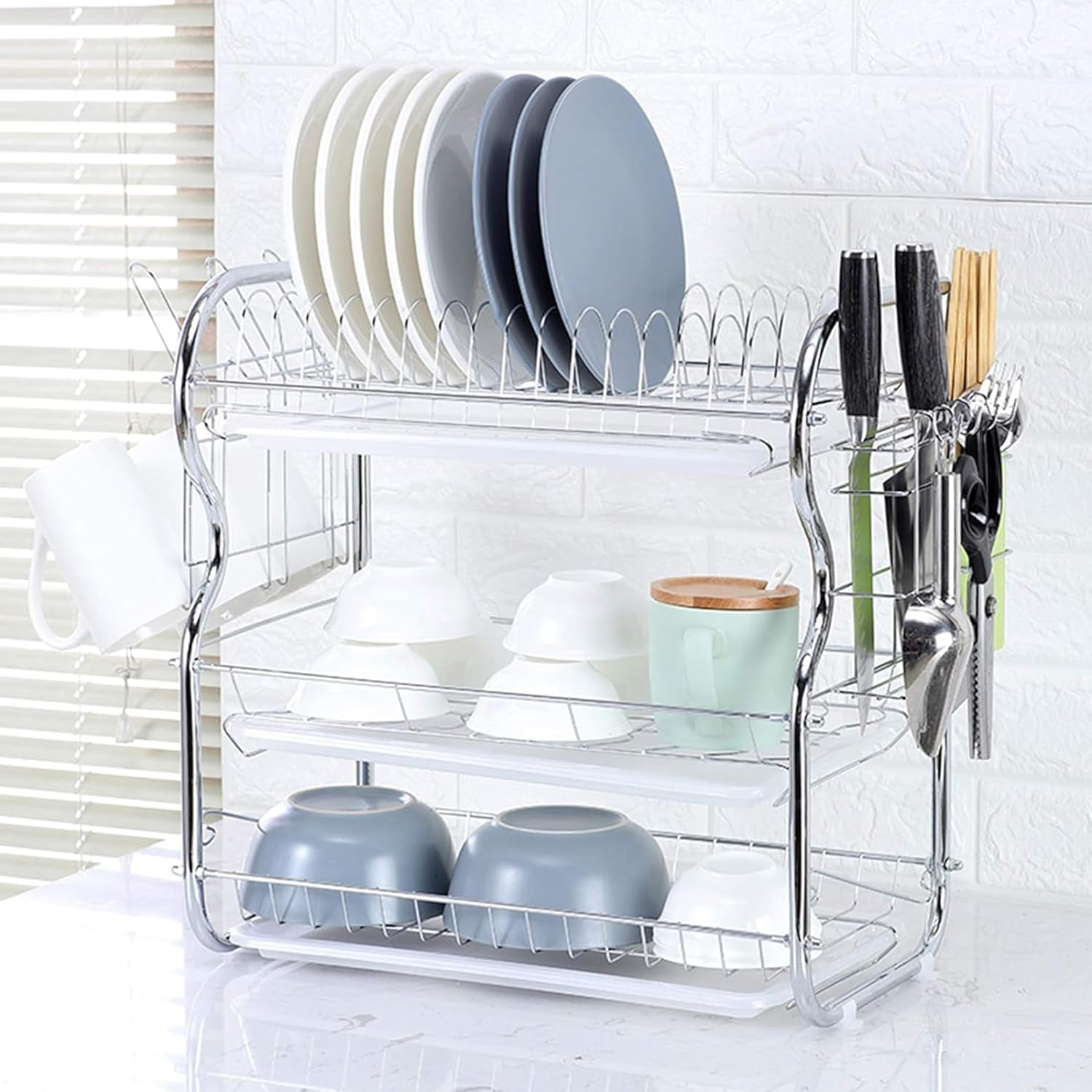 • LARGE CAPACITY: This 3-Tier Dish Drying Rack offers three spacious tiers to neatly organise plates, bowls, cups, and cutlery, ensuring maximum storage for your kitchen. Includes a detachable drain board to keep countertops clean and dry, making it an essential for modern kitchens.
