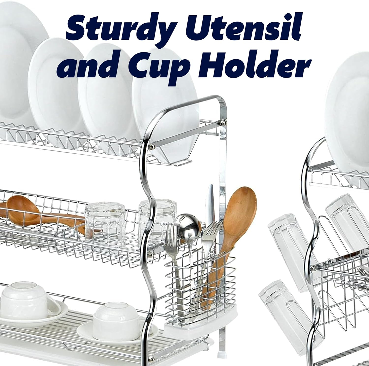 B&S Dish Drying Stand | Large Double Dish Rack with 3 Tiers and Utensil Holders | Chrome Plated + PP Plastic Kitchen Drying Rack with Detachable Drain Board | White Utensil Drying Stand