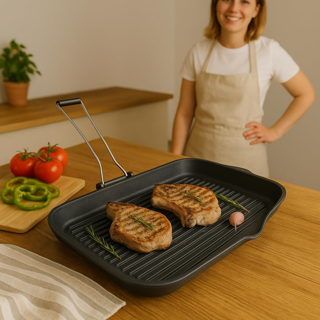 • 🍖 Premium Cast Iron Grill Pan – Crafted from 100% heavy-duty cast iron for long-lasting durability and even heat retention. Perfect for indoor grilling with rich, smoky BBQ flavor.