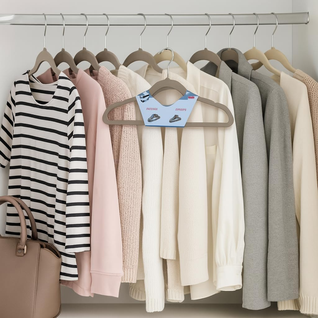- 🧥 Non-Slip Velvet Finish – Keep Clothes in Place: Each hanger is covered in soft velvet flocking that prevents clothes from slipping, even the lightest fabrics. Say goodbye to wrinkled clothes on the floor—your garments stay secure and crease-free.