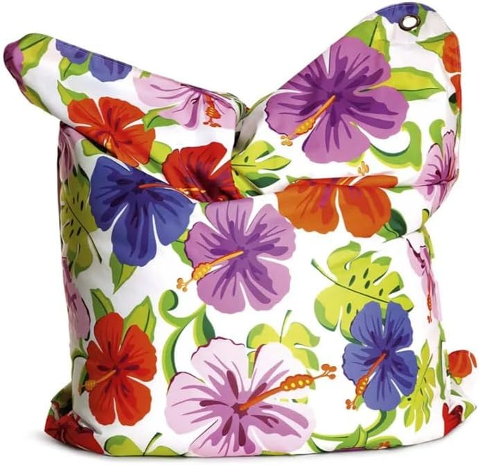• Vibrant Design: This bean bag features a vivid floral pattern with shades of purple, red, orange, green, and white hibiscus flowers on a white background.