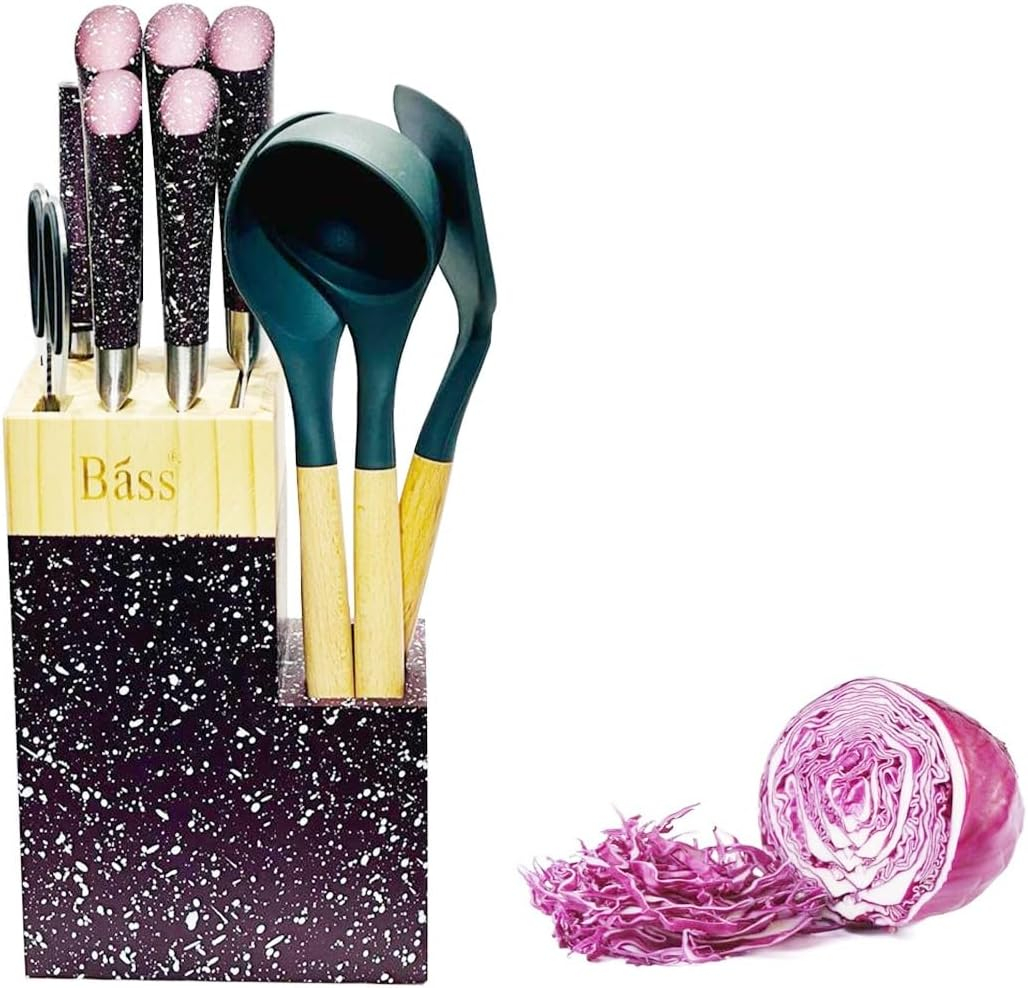 Knife Set 12-Pc with Silicone Cooking Utensils with Wooden purple Stand Bass